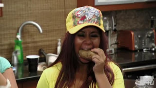 Downstairs Jwoww is watching Snooki and Deena drink themselves into a stupor and Snooki decides she’s going to gnaw on a raw potato.